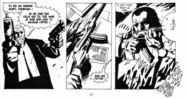 Jack le privé et son vieil ami Giusti, tueur professionnel, commencent à se démener pour innocenter Jack. Giusti c'est le type qui jure dans la première case. Alors qu'ils sont en observation à la porte du hangar, il semble péter un cable et fait brusquement irruption à l'intérieur en interpellant le méchant, "Donovan". Observez bien que la mitraillette de Donovan est bien située sur le bureau, un bon mètre devant lui.